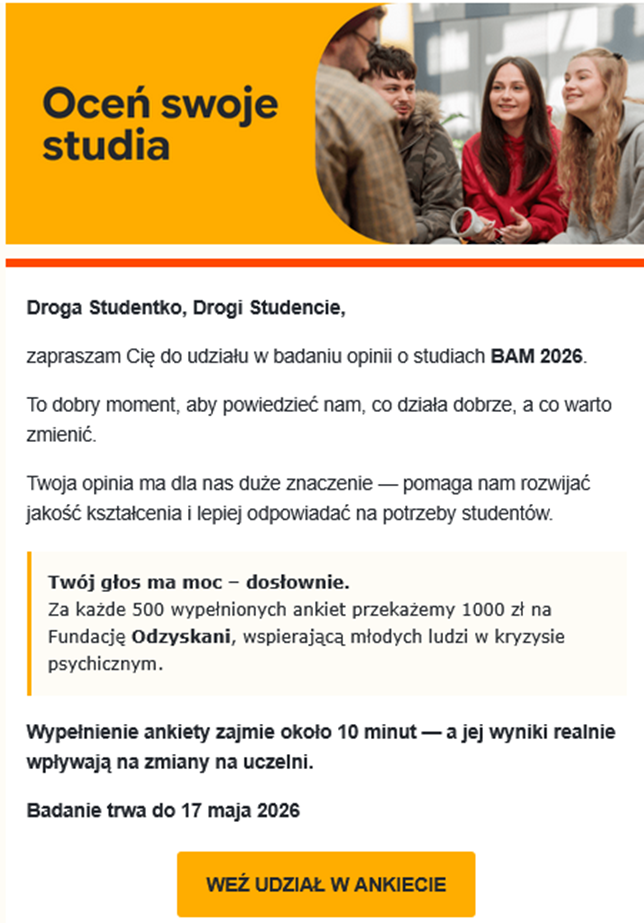 Sprawdź maila uczelnianego! Szukaj wiadomości: „BAM 2026: podziel się swoją opinią o studiach”